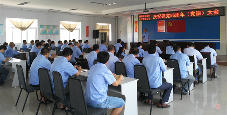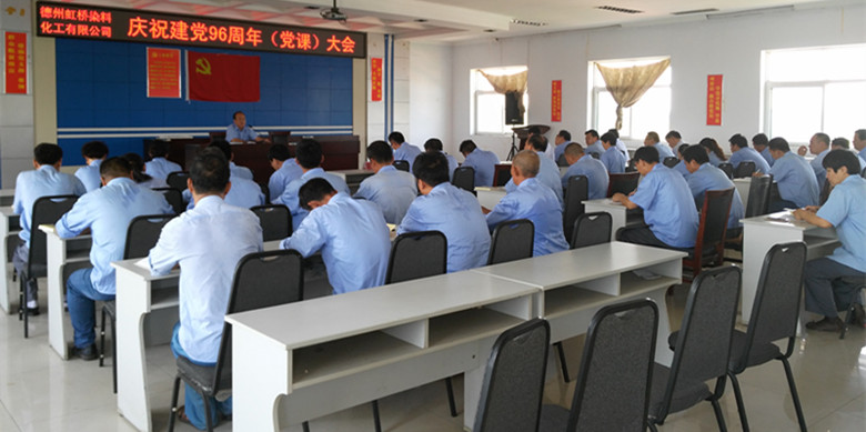 德州虹橋染料化工有限公司三個支部的全體黨員于2017年7月8日上午9點在公司辦公樓4樓黨員活動室進行了“慶祝建黨96周年(黨課)大會”學習。這是今年以來3個支部全體黨員第一次集體學習。黨課開始前,全體黨員站在黨旗下,莊嚴的重溫入黨誓詞(視頻播放)。本次黨課學習,由公司董事長黨總書記吳高樓主持,在紀念我黨建黨96周年之際,公司黨總支委員總經(jīng)理申書信同志以“化工行業(yè)安全”為主題,講了德州虹橋染料化工有限公司當前面臨的生產(chǎn)安全環(huán)境和實際困難,用近期周邊其他化工單位發(fā)生的安全事故,聲情并茂,娓娓道來,為黨員們敲響安全的警鐘。黨員們對安全生產(chǎn)的認識又提高了一個層次。吳總要求黨員們要積極發(fā)揮黨員的先鋒模范作用,以實際行動為榜樣,帶動德州虹橋所有職工牢記安全生產(chǎn),人人有責。。